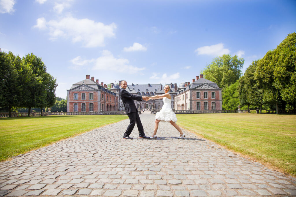 Greet en Antoine trouwden op een warme zomerdag, met dat soort licht waar iedereen meteen zachter van wordt. Hun officiële foto’s kregen iets bijzonders mee, omdat ze die mochten maken op het Kasteel van Beloeil — een plek die tegelijk sprookjesachtig en statig aanvoelt.